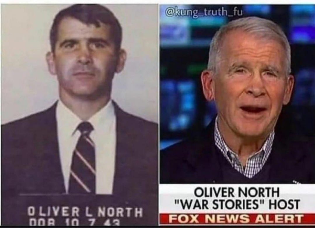 The guy on the left was arrested and convicted for illegally selling missiles to Iran during the Reagan Administration. The guy on the right is a Fox News 'military analyst' who thinks Iran shouldn't have missiles. They're the same guy…