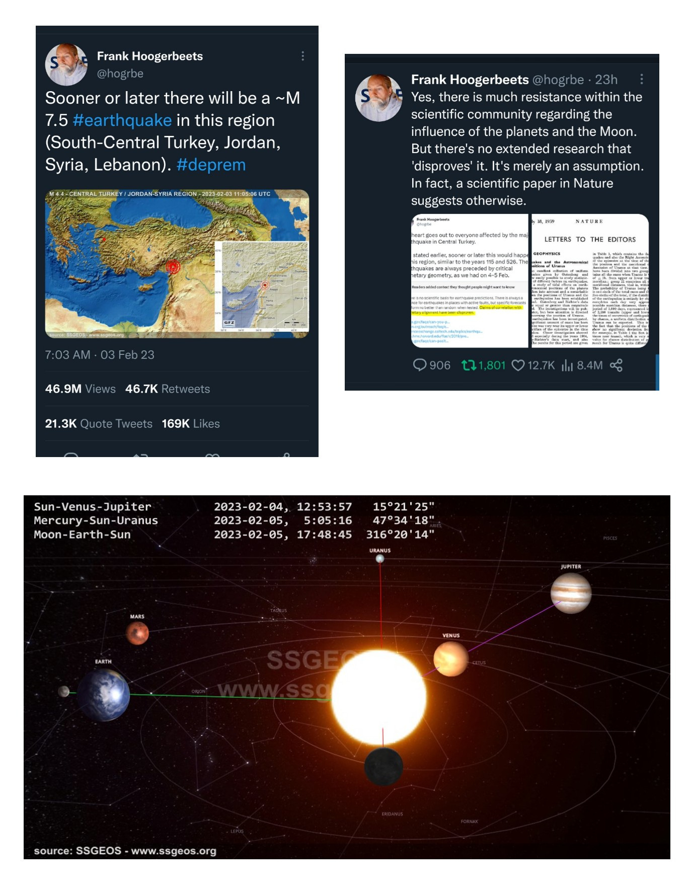 Frank Hooberbeets predicted a Turkey earthquake Feb 1 on Twitter. 5 days later it hit. He made his prediction based on planetary geometry. The YouTube channel SuspiciousObservers is saying our sun is entering an alignment with our galaxy that happens once every 12,000 years and causes an apocalypse…