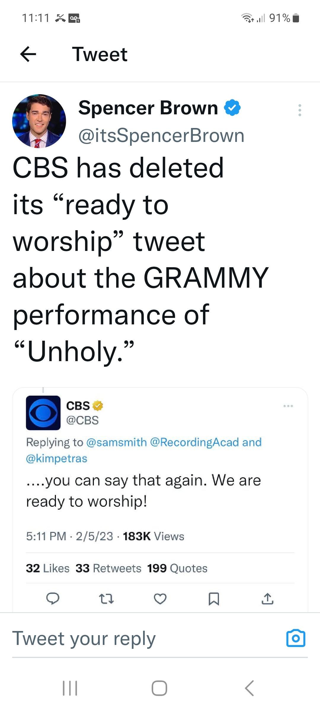 CBS tweet to Sam Smith - we are ready to worship ! Of course deleted…