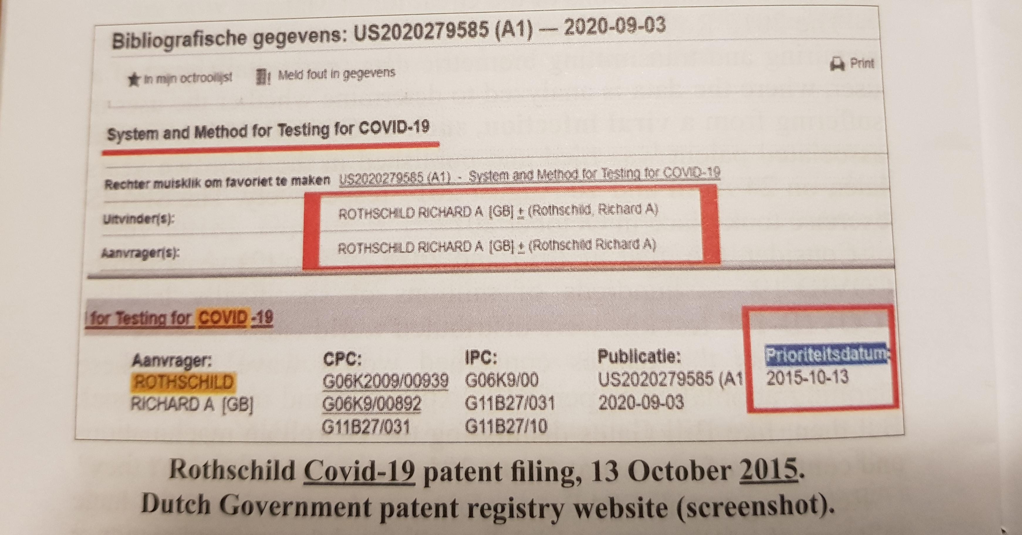 This is interesting… Rothschild covid-19 patent filing 13 October 2015… It appears there is a priority date of 2015, which links to another patent that is used as part of the 2020 application. As in, he had patented a method in 2015, and when Covid came around, reapplied with adjustments for a new patent to apply specifically to C19… Or did they know what was going to happen?