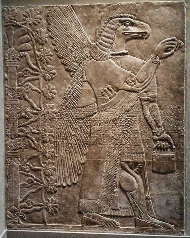 Anunnaki "Ancient Alien" Relief panel Period: Neo-Assyrian Date: ca. 883–859 B.C. Geography: Mesopotamia, Nimrud… As almost everyone is aware by now the bag in the left hand is seen in reliefs all over the world. I believe that when the cyclical mass extinctions occur on earth, these beings descend and openly interact with our ancestors. The bag represents the basics of knowledge required to jumpstart civilization again…