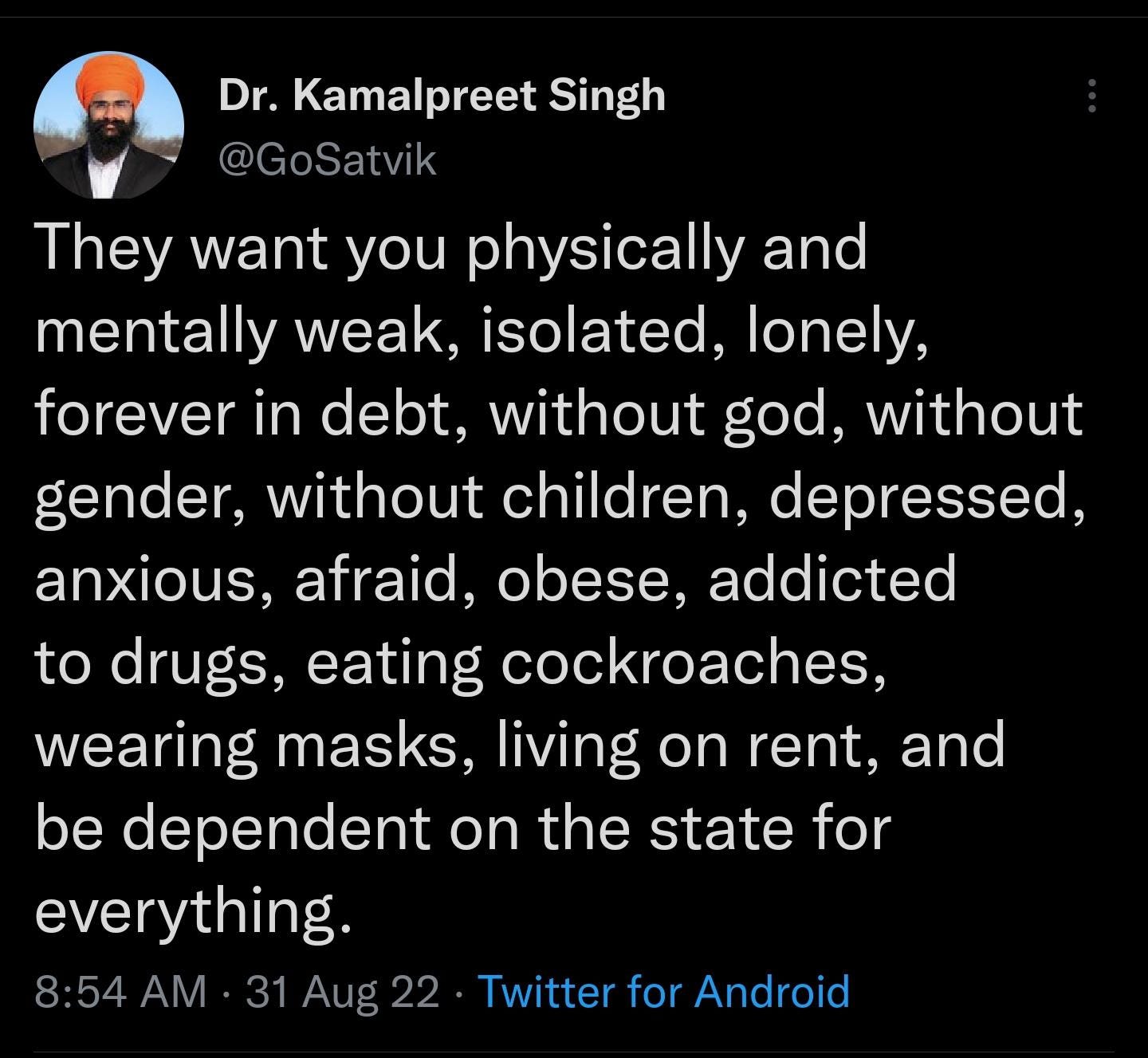 They want you physically & mentally weak, isolated, lonely, forever in debt, without god, without gender, without children, depressed, anxious, afraid, obese, addicted to drugs, eating cockroaches...