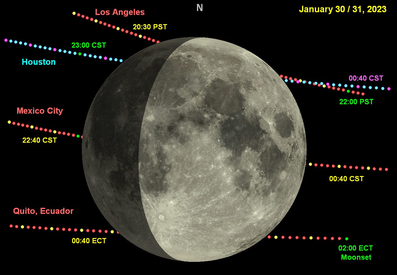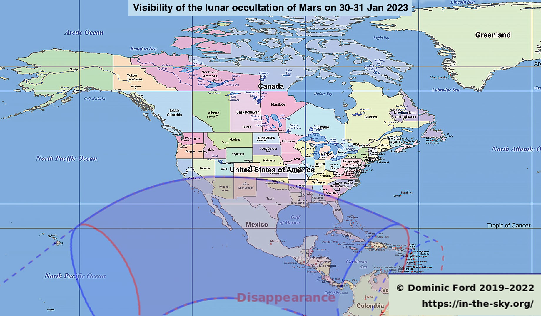 Tonight, Jan. 30-31, the Moon will pass directly in front of Mars, producing a lunar occultation visible across southern parts of the USA and all of Central America…
