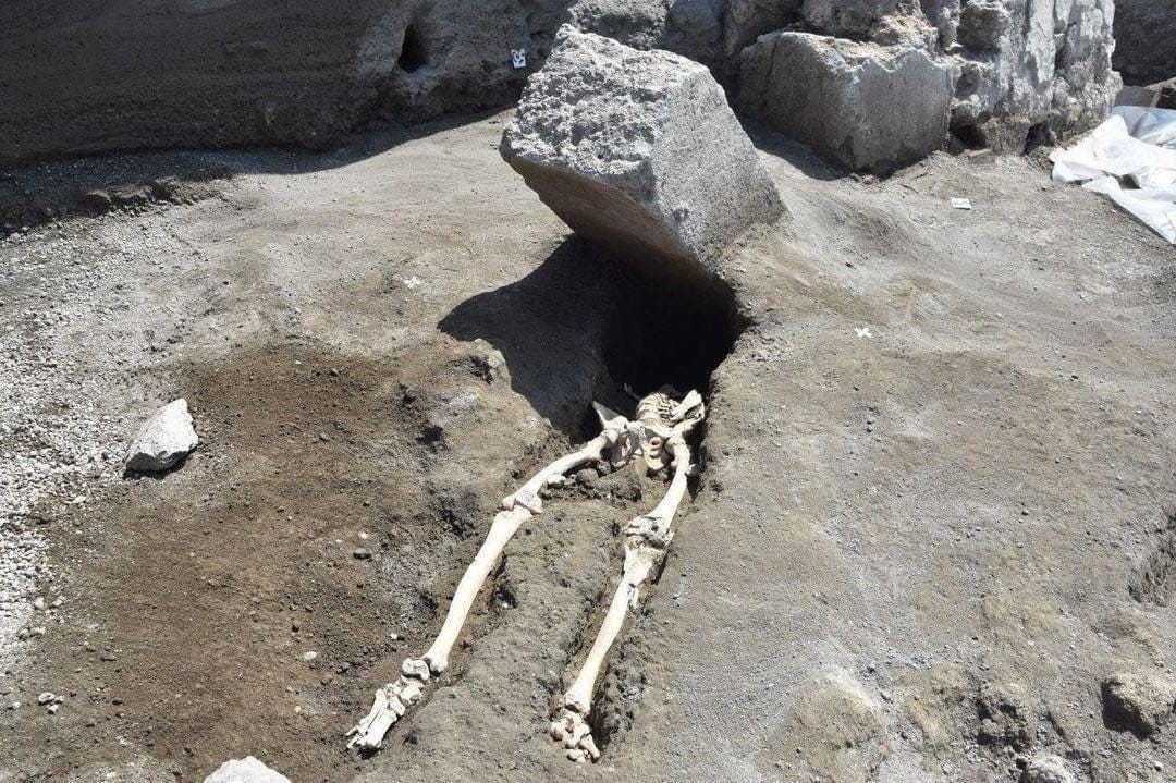 They suspected this 30-year-old Roman man was crushed by a stone block during the eruption of Mt. Vesuvius, in Pompeii (79 AD)… But then they discovered an open-mouthed skull near the unfortunate man’s body…