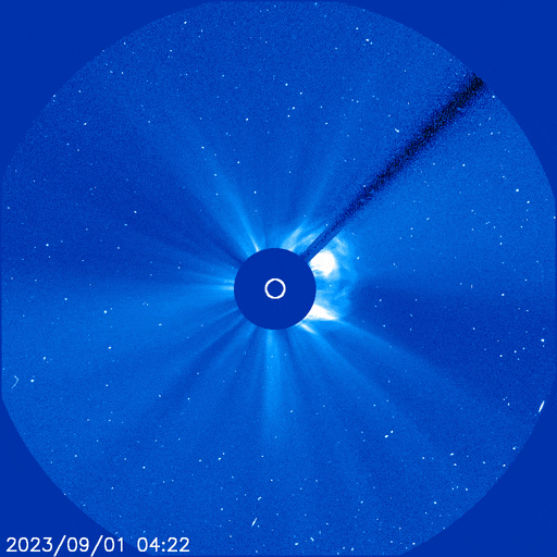 SOHO coronagraphs watched this bright fast CME leaving the sun on Sept. 1st following a long-duration M1-class solar flare from sunspot AR3413. Although it is not heading directly for Earth, the CME's flank is likely to graze our planet…