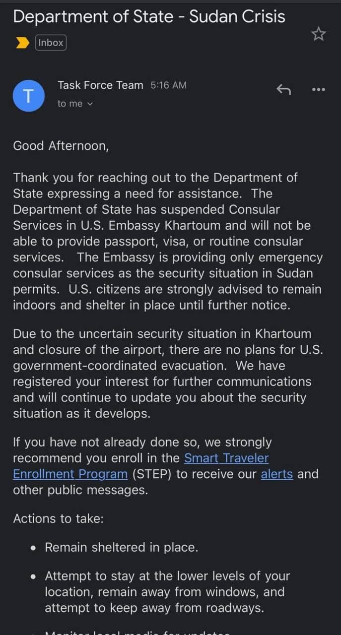 This is what the Dept of State has been telling Americans trapped in Sudan before the military evacuation today of only government personnel. How many are trapped there? Any idea?