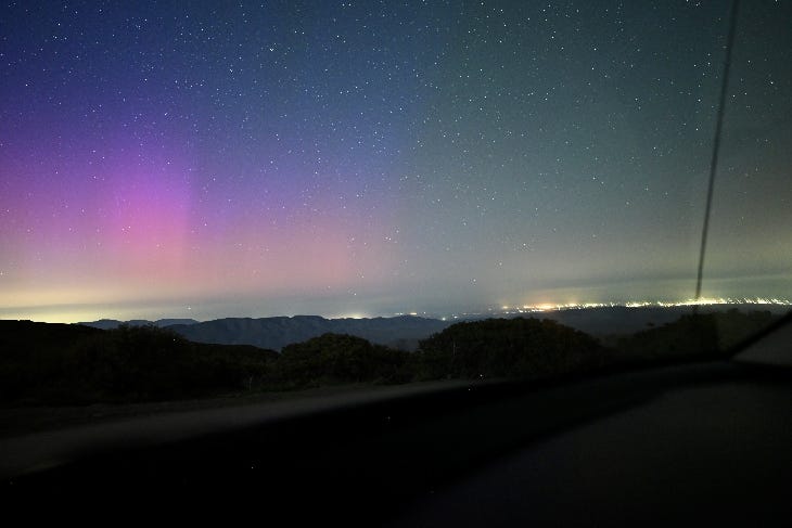 Northern lights spilled out of the Arctic Circle to unusually low latitudes. This picture shows red auroras outside San Diego only ~10 miles from the Mexican border: