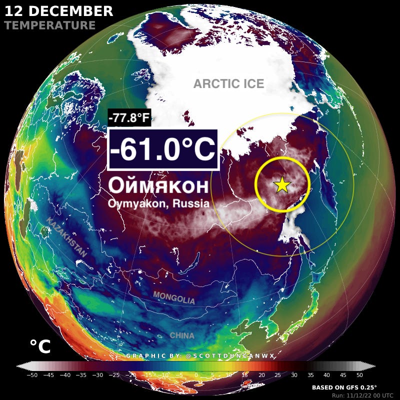 Brutal. The coldest permanently inhabited settlement on Earth, Oymyakon (Russia), just dropped to an unforgiving -61.0°C (-77.8°F). One of the coldest moments in recorded history in this part pf the world for this early in the winter…