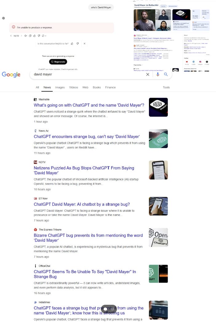 If you haven't heard ChatGPT cannot say the name David Mayer. Someone has restricted this name manually, which is very creepy to as why.