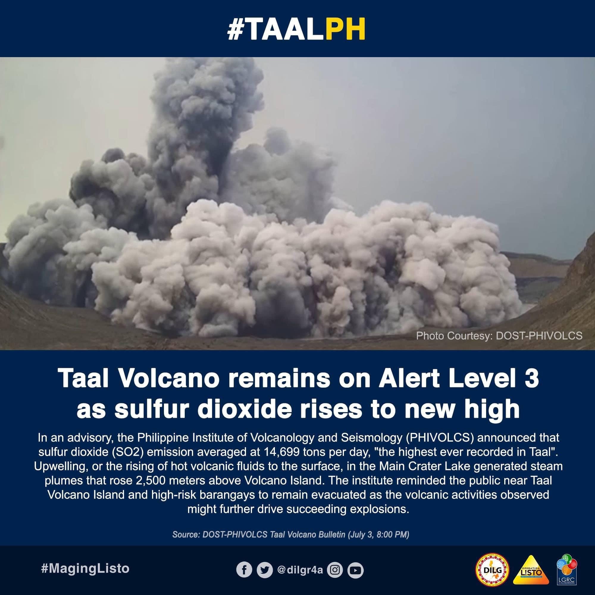 Today, July 3rd, Taal Volcano recorded it’s all-time highest sulfur dioxide emission (about 14,699 tons/day). Previous record was set on Monday, just before its eruption on July 1st…