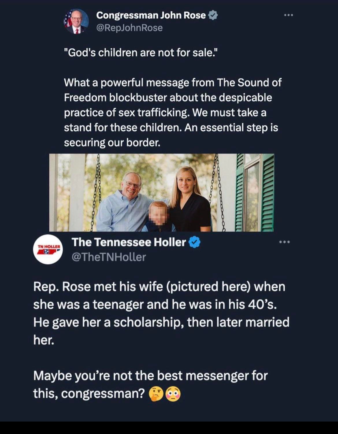 Classic hypocrisy - 40 year old congressman that ‘gave a scholarship’ to a teenager that he eventually married. Not sure this groomer is the right person to seem genuine about solving the issue…