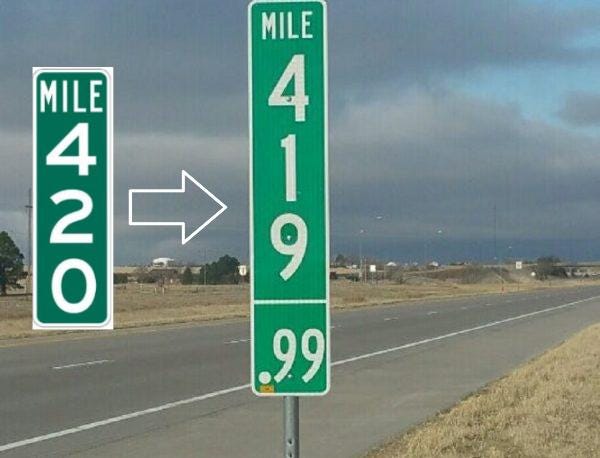 Colorado Dept. Of Transportation replaced mile marker 420 with 419.99 because it was repeatedly stolen by stoners…