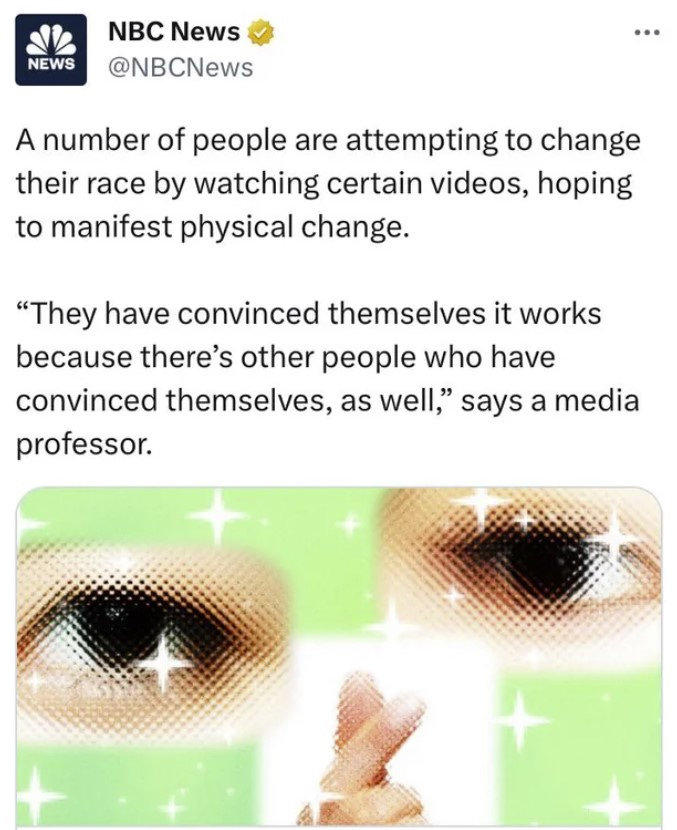 What's going on with the world? hmmm... Looking more and more like the fulfillment of Scriptures to me. Definitely confirms we are at war with dark principalities. As for those sad mentally ill who believe they can become a different race, it makes perfect sense if you believe you can choose your gender, or decide you are a cat or dog, or believe all one has to do is say it to make it so. Today, I am feeling like I am 20 not 76. Prove me wrong.