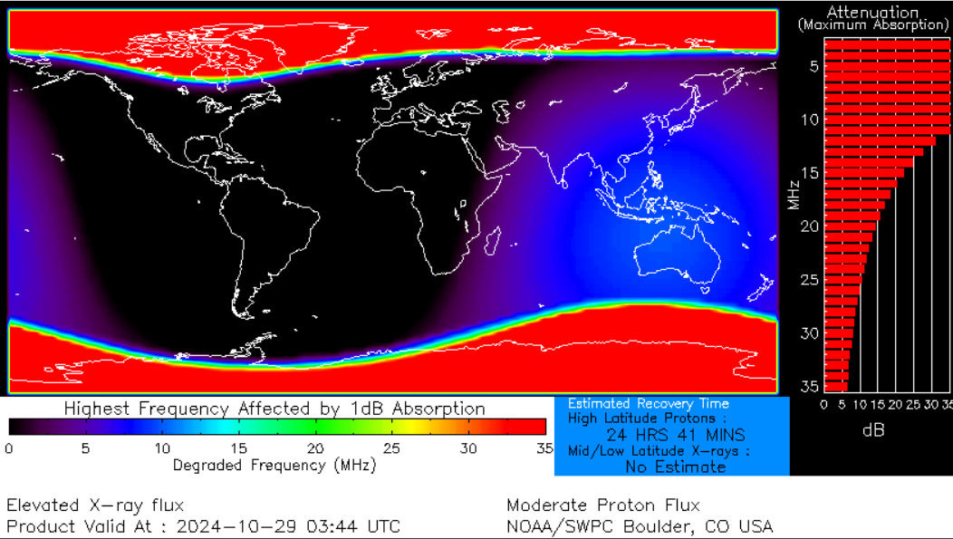 For the 3rd day in a row, energetic protons are raining down on Earth. It's an S2-class radiation storm. The protons were accelerated by X-class solar flares on Oct. 24th and 26th.