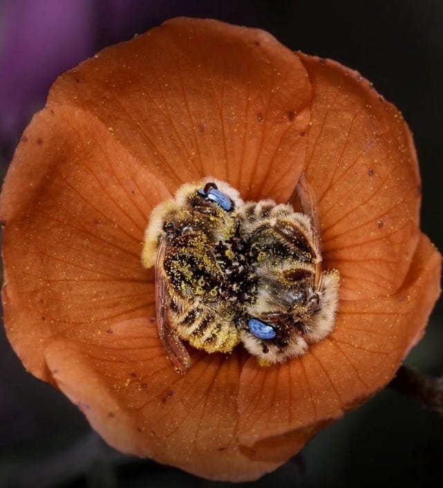 Bees sometimes fall asleep in flowers due to a combination of exhaustion and temperature regulation.