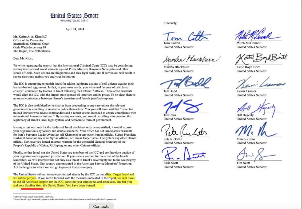 US senators are openly threatening the Chief of the International Criminal Court with sanctions and a travel ban for his family The masks are coming off…