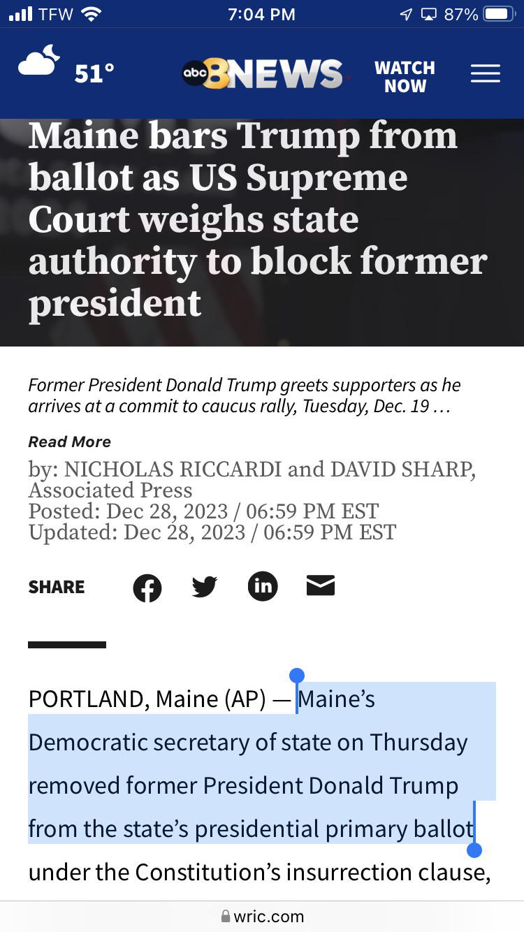 Colorado puts Trump back on the ballot; Then Maine immediately takes him off their ballot... RIP America 1776-2024…