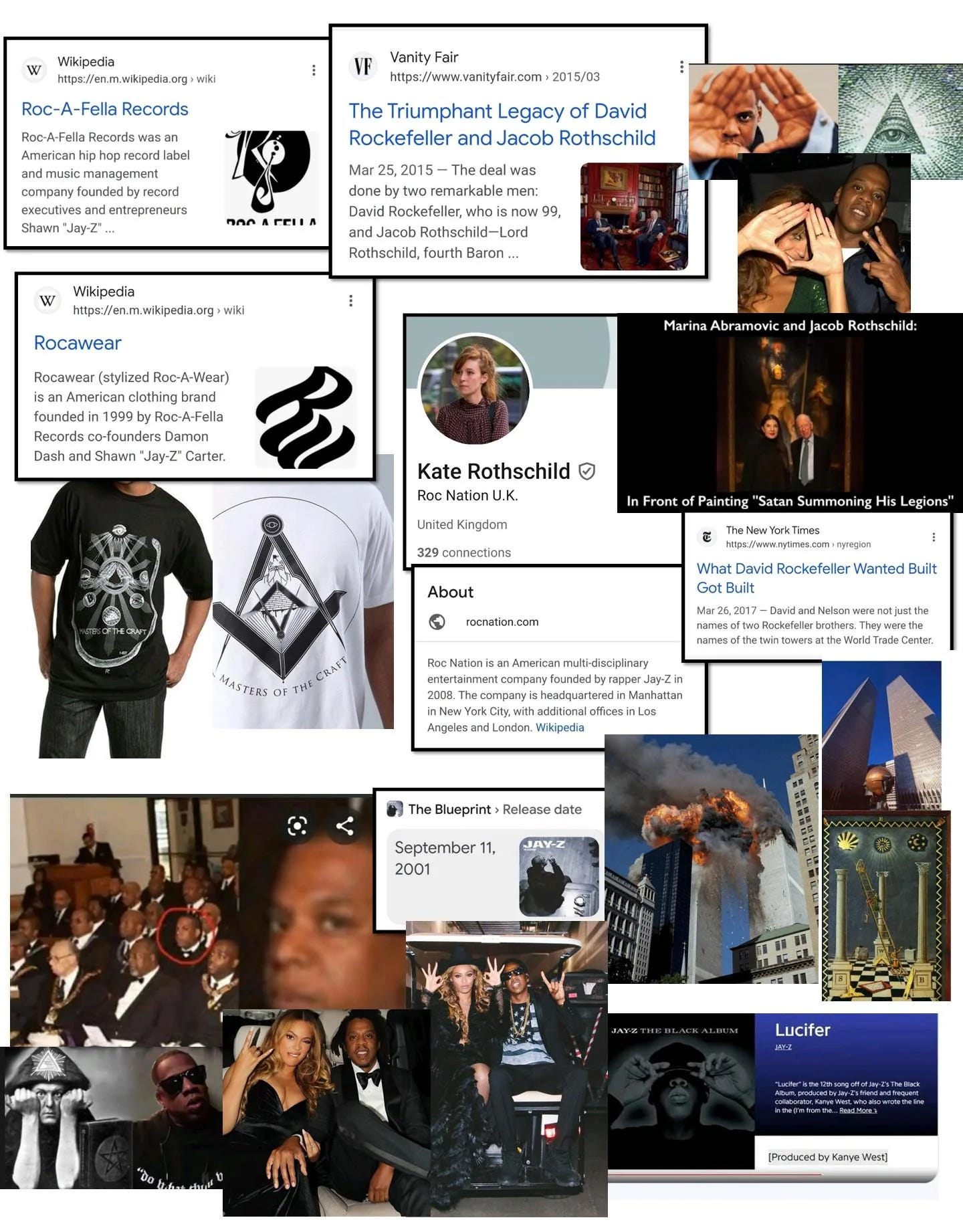 David Rockefeller (like Jay Z's Roc-A-Fella records) built the Twin Towers in 1968. Jacob Rothschild brought em down 9/11/01 33 years later in a Freemason ritual. Freemason Luciferian Jay Z confirmed this by releasing "The Blueprint" literally on 9/11/01 and having Kate Rothschild run Roc Nation UK…