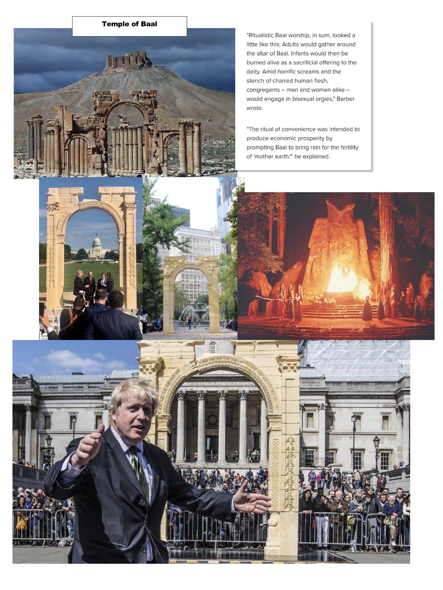 Why did the "elites" put up model replicas of the Temple of Baal entrance in major cities around the world in 2016? The Temple of Baal is where they would burn kids alive to sacrifice to Baal. Also, why do the "elites" do mock ritual child burning sacrifices to Moloch at Bohemian Grove?