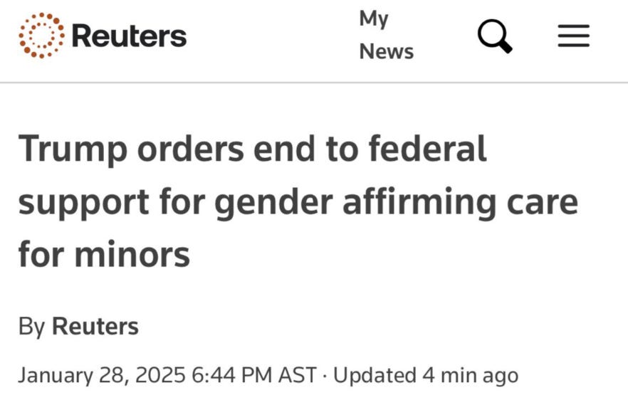 Yeah man! Trump has signed an executive order banning federal support for transgender medical treatments for children, calling them “chemical and surgical mutilation.”