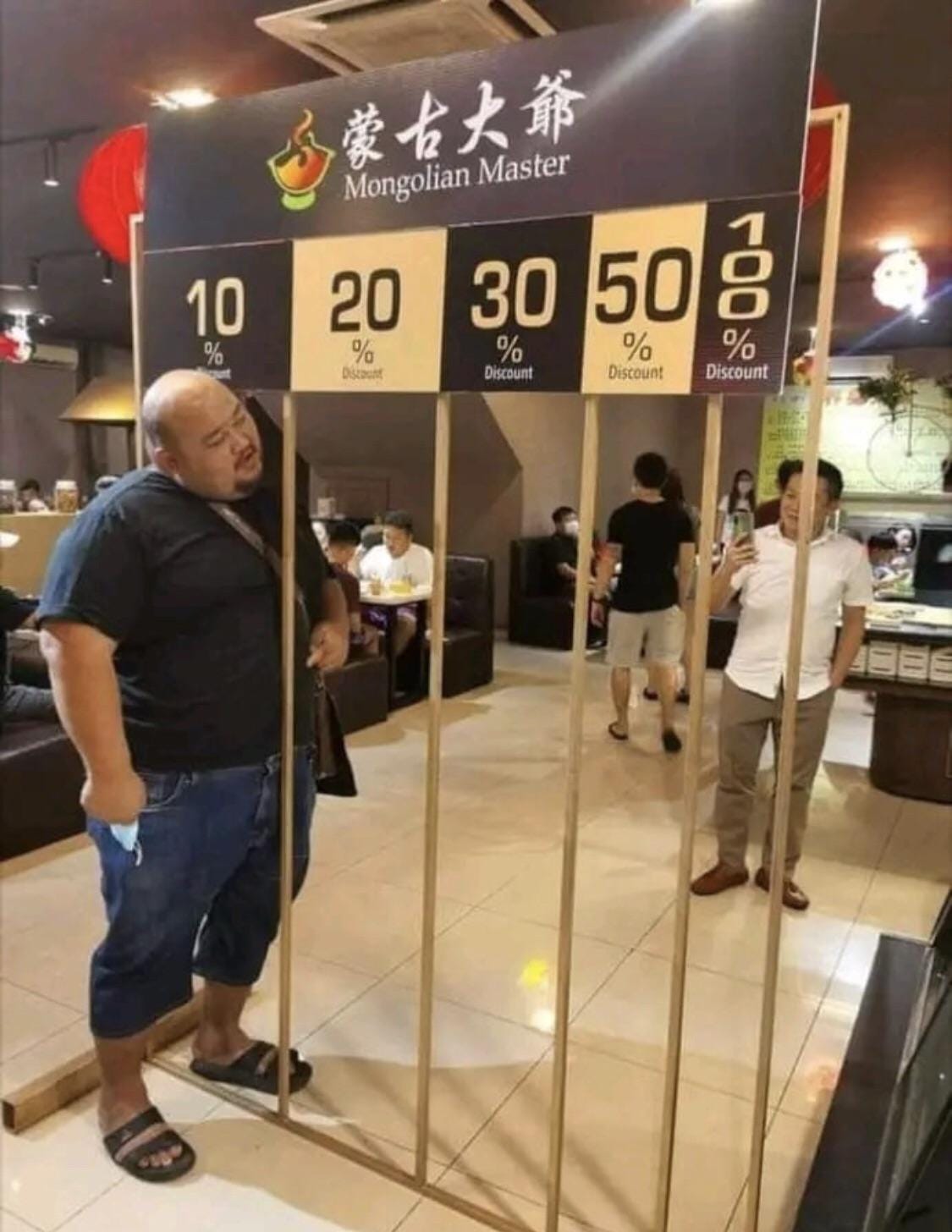 There is a restaurant in Malaysia that gives you a variable discount based on how thin you are… Is this done before or after the meal?