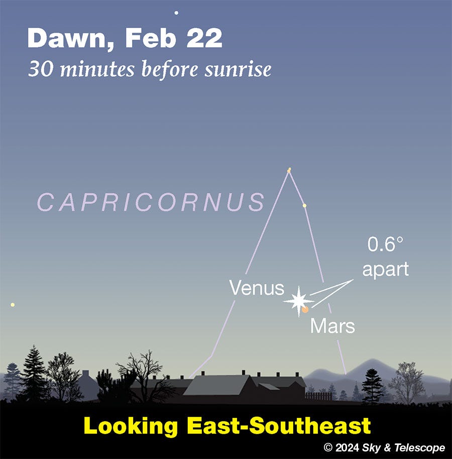 Set your alarm for dawn. On Thursday, Feb. 22nd, Venus and Mars will meet in the sunrise sky. Look low and east to see the two planets only 0.6 degrees apart. You'll notice brilliant Venus first; it's an easy naked-eye object even in twilight. Binoculars may be required to spot red Mars surrounded by the glow of dawn…