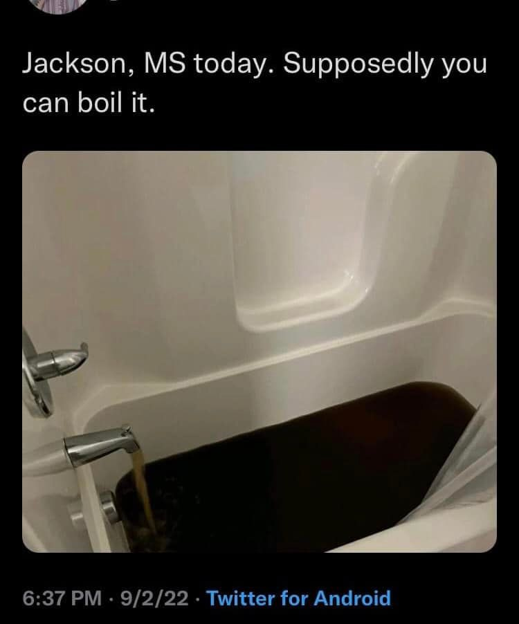 Jackson, Mississippi! Apparently, it’s safe to drink after boiling… Your government really loves you… Now, show them your love! Don’t surrender! Revolt! Picture taken on September 2, 2022…