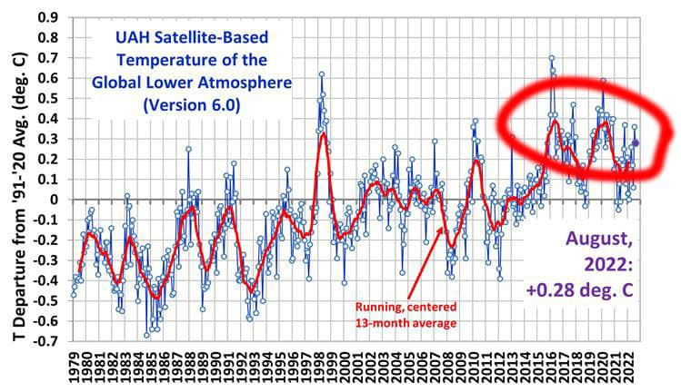 Climate change? The August 2022 temperature is at the SAME LEVEL as in August 1998. According to the data of the space agency, there has been NO GLOBAL WARMING in almost eight years despite more CO2 being put into the atmosphere…