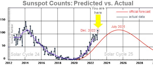 2022 ended with the highest monthly sunspot number in 7 years. This plot from NOAA shows the ascending progression of Solar Cycle 25: