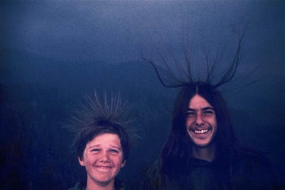 Two grinning brothers, hair standing on end, unaware that they were minutes away from being struck by lightning while climbing Moro Rock in California’s Sequoia National Park…